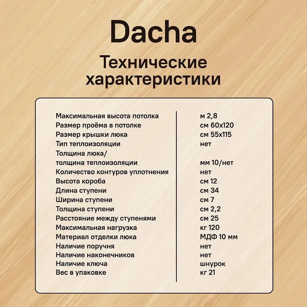 DACHA выделяется устойчивой конструкцией с продольными насечками на ступенях, обеспечивающими максимальную противоскользящую защиту. Это делает подъем на чердак удобным и безопасным для всех — от взрослых до пожилых. Облегченный люк без утеплителя снижает цену без потери прочности: длина ступени 340 мм, ширина 80 мм, шаг 250 мм — универсально для любого роста. Несмотря на легкость, лестница выдерживает до 120 кг равномерной нагрузки.