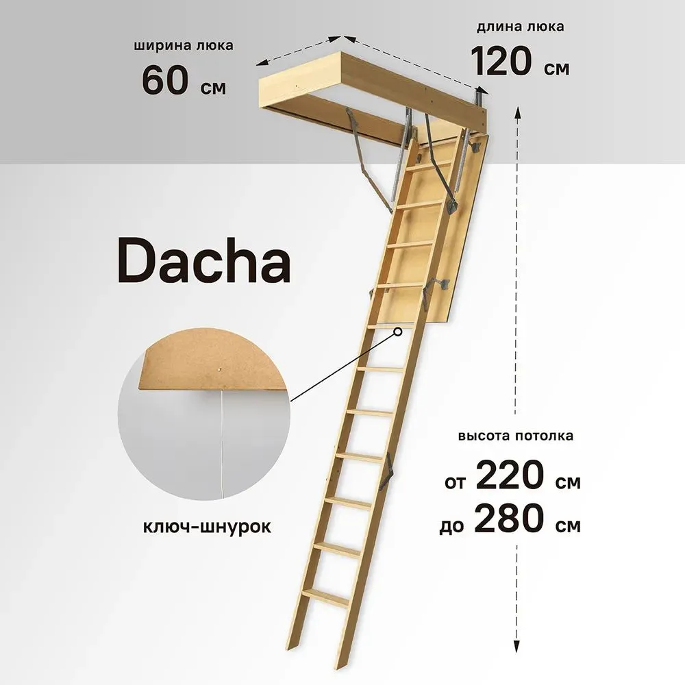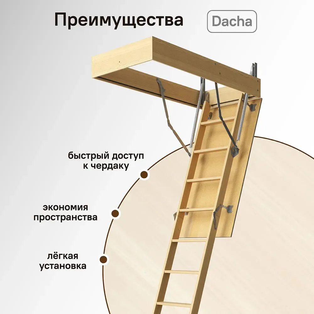 Чердачная лестница Дача от Дёке — самая компактная и легкая модель в линейке (вес всего 21 кг), идеально подходящая для дач, летних домов и квартир в Минске с потолками до 2,8 м. Купить чердачную лестницу DACHA в Беларуси — значит выбрать безопасность и комфорт по доступной стоимости. Бесплатная доставка по Минску день в день, отправляем курьерской службой по Беларуси с получением 1-2 дня прямо на адрес — даже в деревни и товарищества по выгодным тарифам!