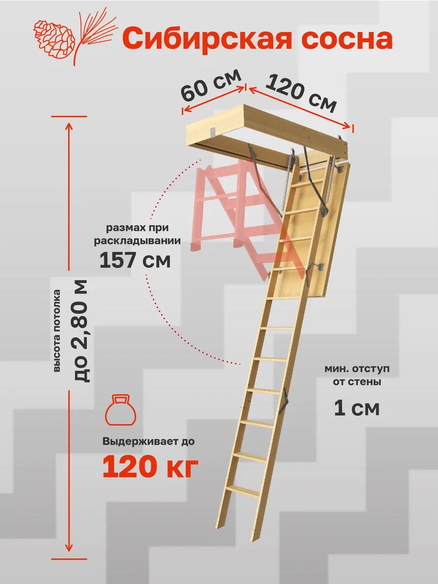 Три складные секции на металлической фурнитуре выдерживают 120 кг, подходят для хранения вещей. Рельефные ступени из хвойной древесины предотвращают скольжение при подъеме инвентаря или коробок.