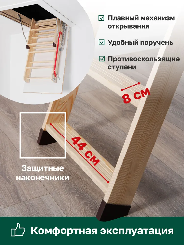 Стандартный набор включает стержень для открывания люка, боковой поручень для опоры и противоскользящие наконечники на ножках – все для максимальной безопасности. Высоко расположенная верхняя ступень упрощает выход на чердак, а продуманная геометрия исключает неудобные углы. Монтаж не требует профессиональных навыков: следуйте инструкции, закрепите короб анкерами к балкам – займет 1–1,5 часа. К базовой комплектации добавляются вторые поручни или расширенные наконечники за доплату.