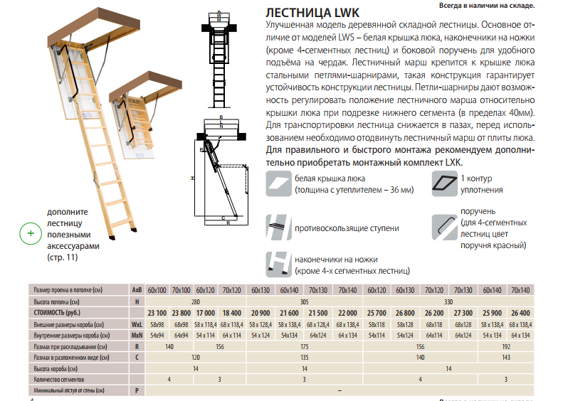 Ниже приведена таблица всех моделей LWK для подбора чердачной лестницы