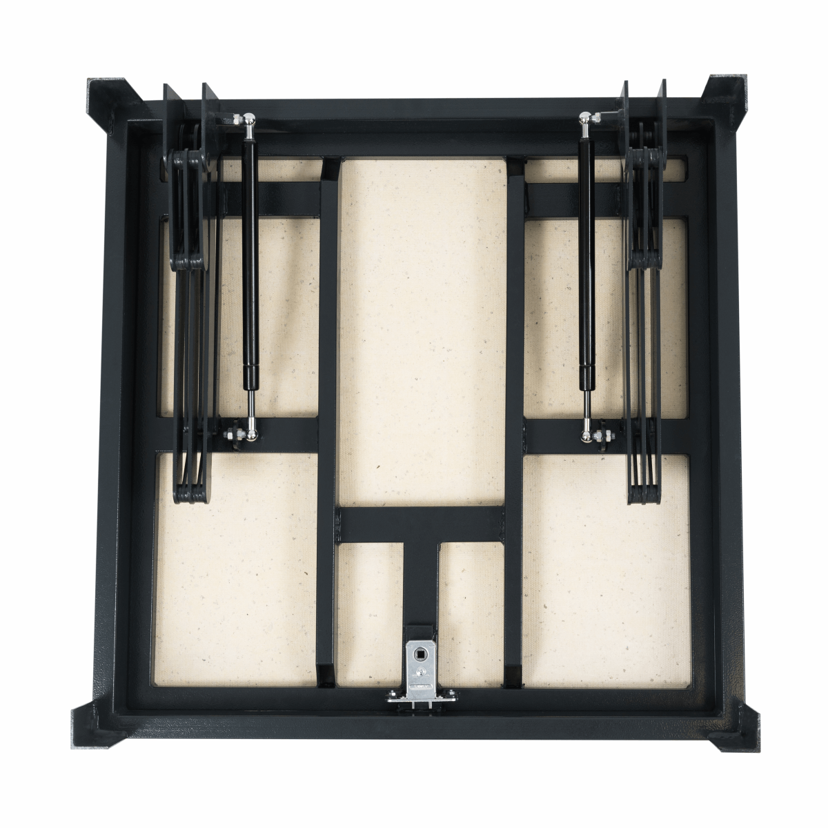 Рама выполнена из стальной профильной трубы 50х25х2 мм с приваренными по краям кронштейнами из уголка и монтажными отверстиями. Крышка люка сделана из стальной трубы 40х20х1,5 мм и оснащена газовыми амортизаторами, которые облегчают открытие и удержание крышки в поднятом состоянии. Крышку можно облицовывать тонкой керамической плиткой толщиной 10-12 мм, а также прочными половыми или террасными досками до 50 мм.