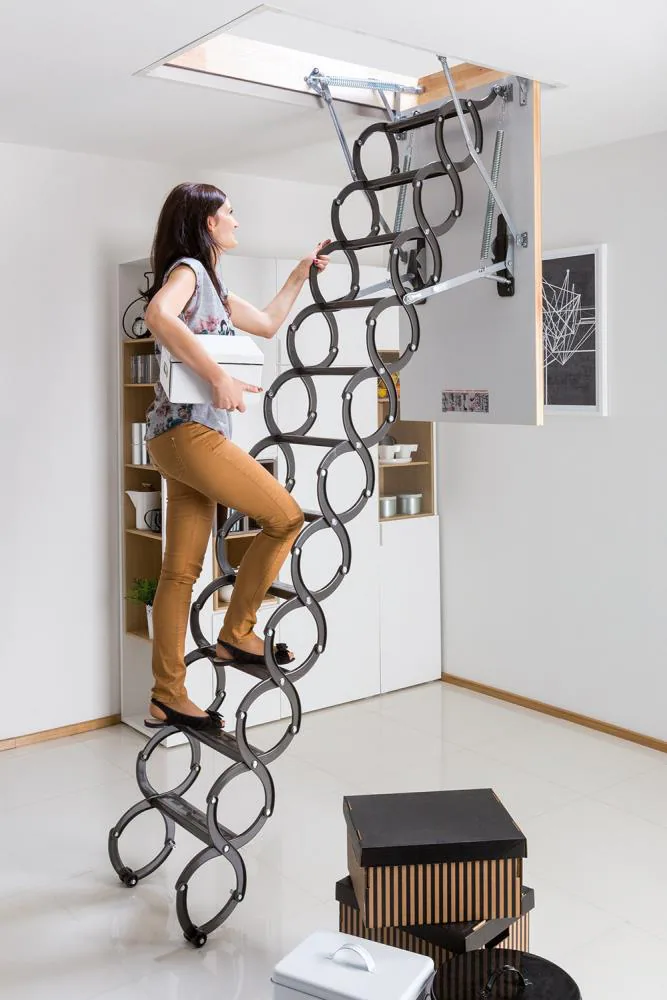Ножничная конструкция, состоящая из элементов в форме буквы "S", высота чистовая от пола до потолка 2,8 метра. Материал короба, - сосна, пропитанная противогрибковыми ингибиторами. В складном состоянии выглядит как компактный короб, который встраивается в потолок, встроенный замок под длинный ключ-ручку закрывает доступ на чердак и обеспечивает безопасность проникновения посторонних лиц.