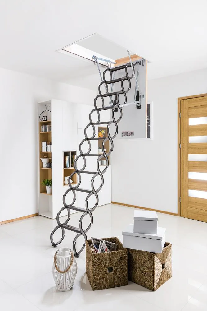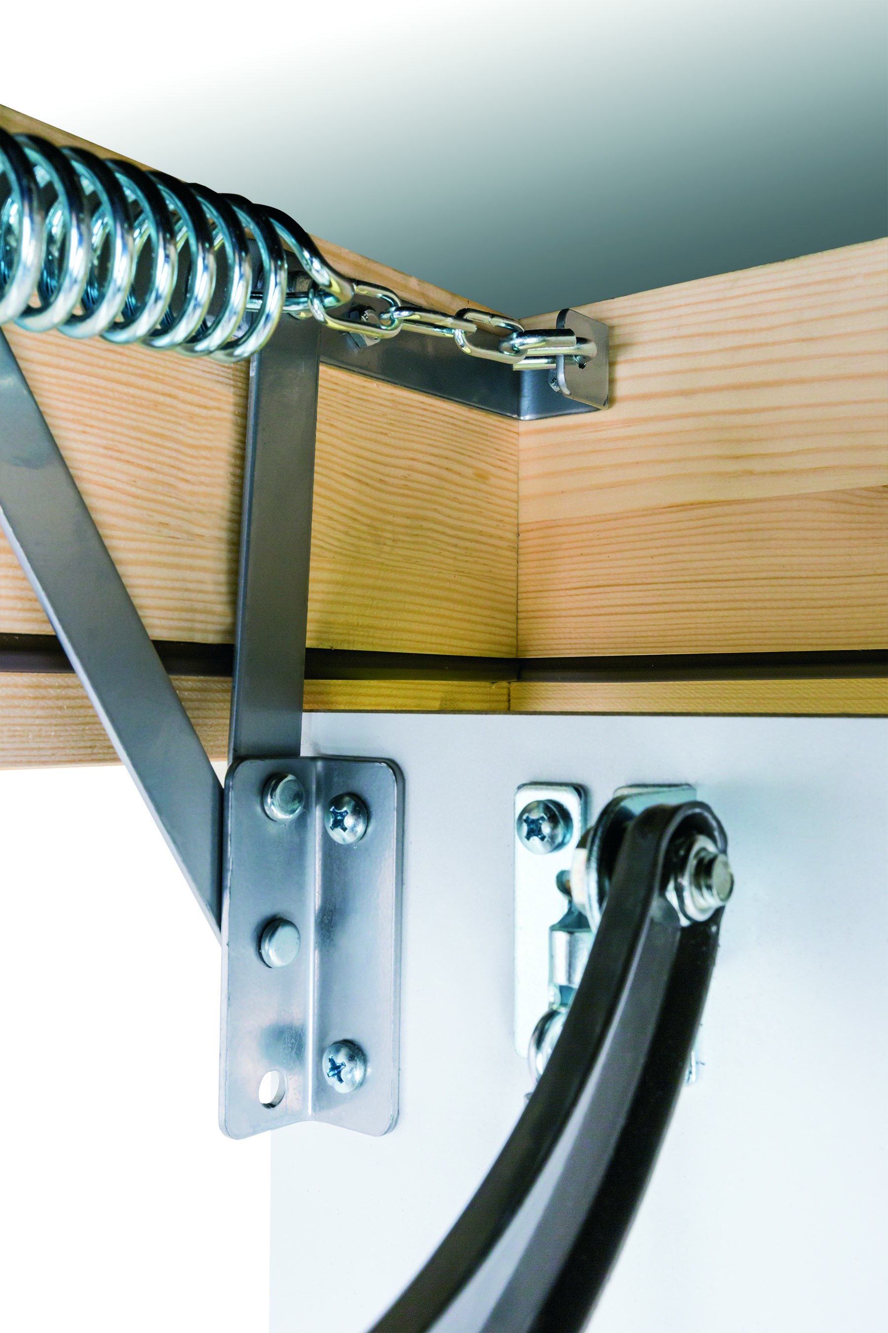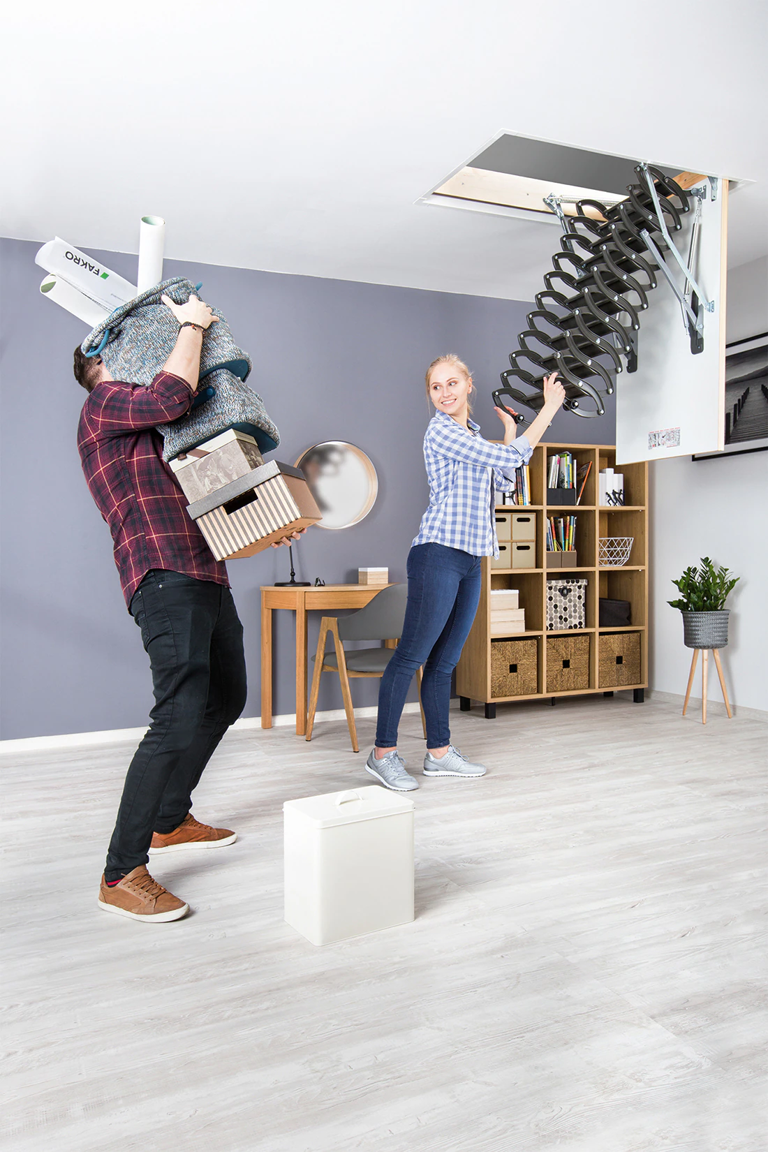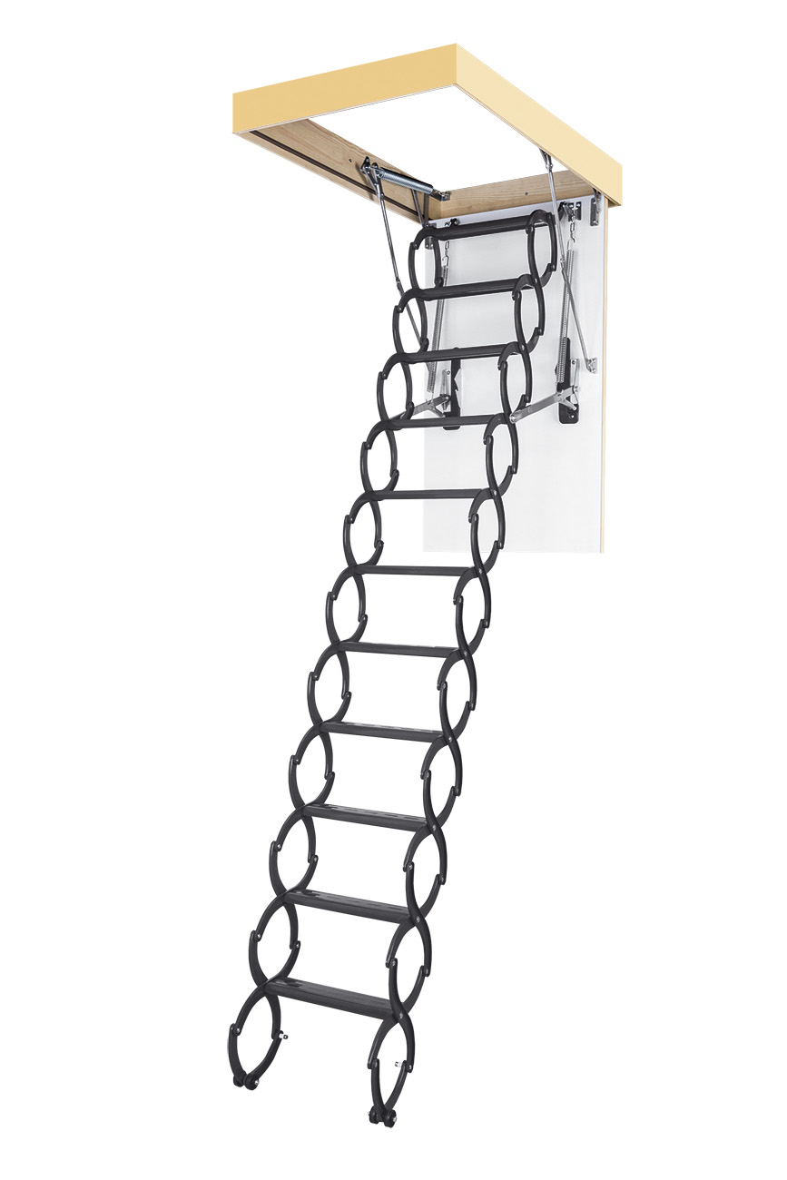 Ножничная чердачная лестница Fakro LST-B проста в монтаже, удобна в эксплуатации, компактна и функциональна помогает экономить место в доме и хорошо впишется в любой интерьер. Надёжный способ стыковки сегментов металлических ступеней - усиливаю конструкцию, что позволяет выдерживать большие нагрузки до 200 кг. Крышка люка представляет собой "сэндвич" толщиной 36 мм отделанный ДВП белого цвета и вложенный внутрь утеплителем 30 мм из пенопласта. По периметру короба установлен уплотнитель который позволяет избежать потери тепла и попадания холода. Дверь проста в монтаже – установка осуществляется со стороны помещения, без необходимости поднятия на чердак, удобные металлические пластины быстро соединяют ее с коробом после установки лестницы в проеме.